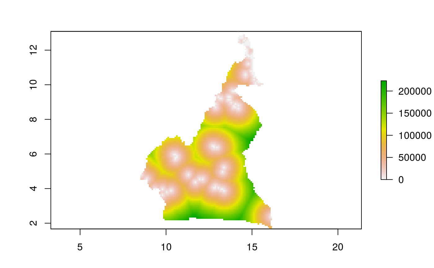 cmr <- mapMCDA_datasets() dist_wb <- distance_to_vector(cmr$water_bodies, cmr$animal.density) raster::plot(dist_wb)